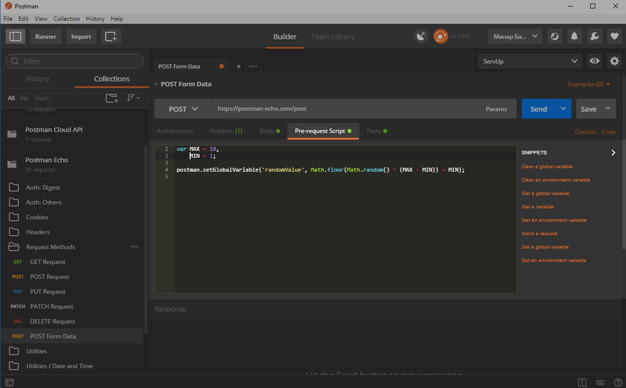 Let’s use a request that returns the sent value. Send it. First, a random value is counted, then it will be assigned to the Environment variable which will fit in the request body. Response: