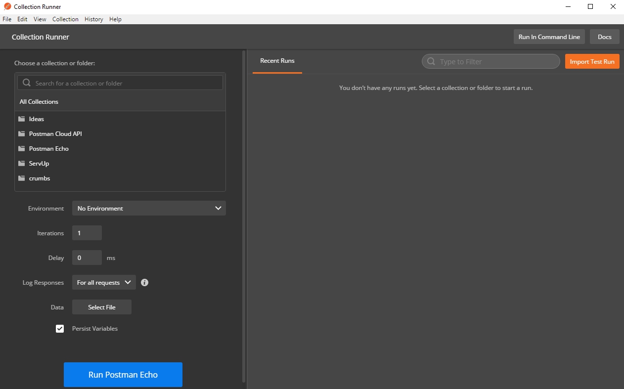It would be nice to automate the testing process a little. For example, you need to send requests several times and look at test results. Or you need to check the whole collection at once. For this, Postman has a `Collection Runner`.