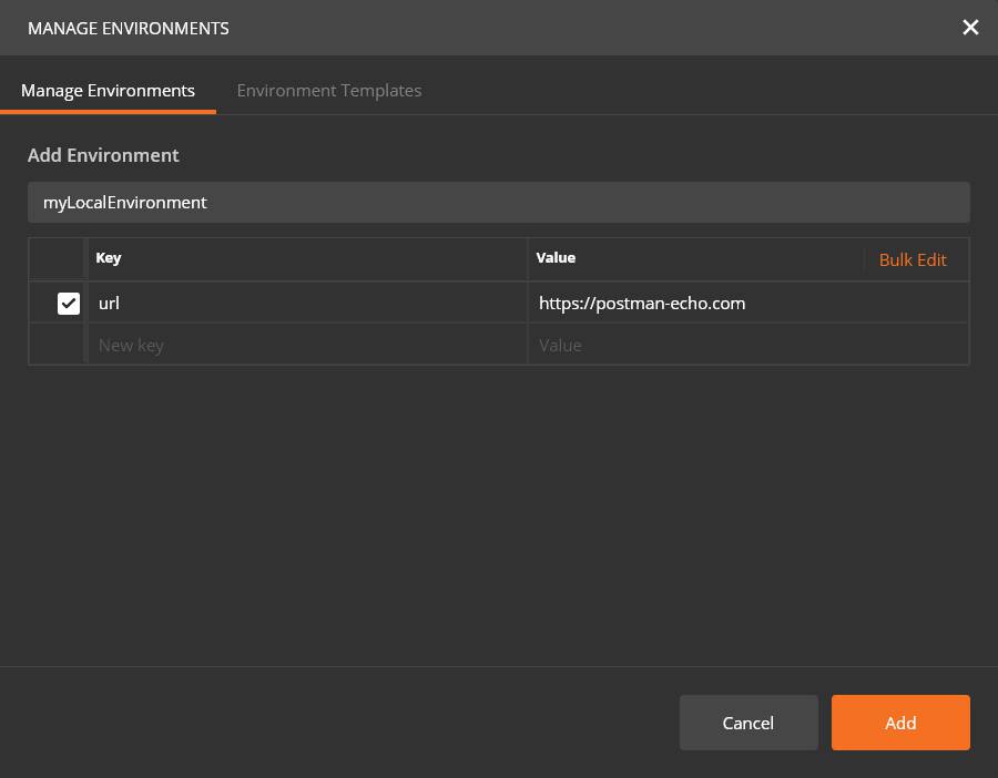 Add the new environment: enter a name of it and the parameters. Press “Add” button to save.